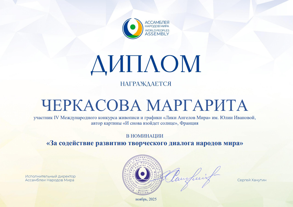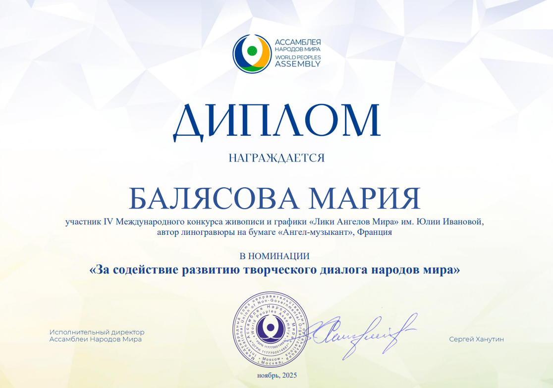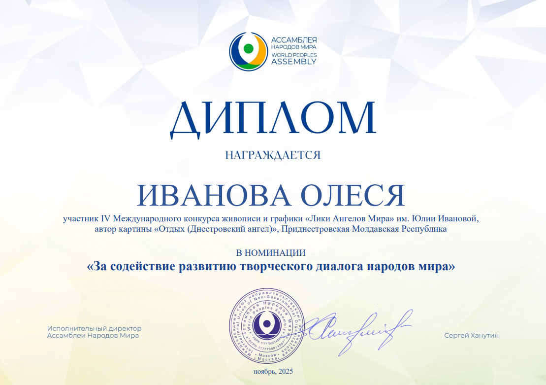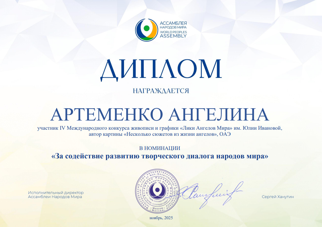 Несколько работ, принимавших участие в конкурсе "Лики Ангелов Мира" - 2025, а также их авторы из разных стран получили специальные Дипломы от Ассамблеи народов мира. Очень высокая оценка!