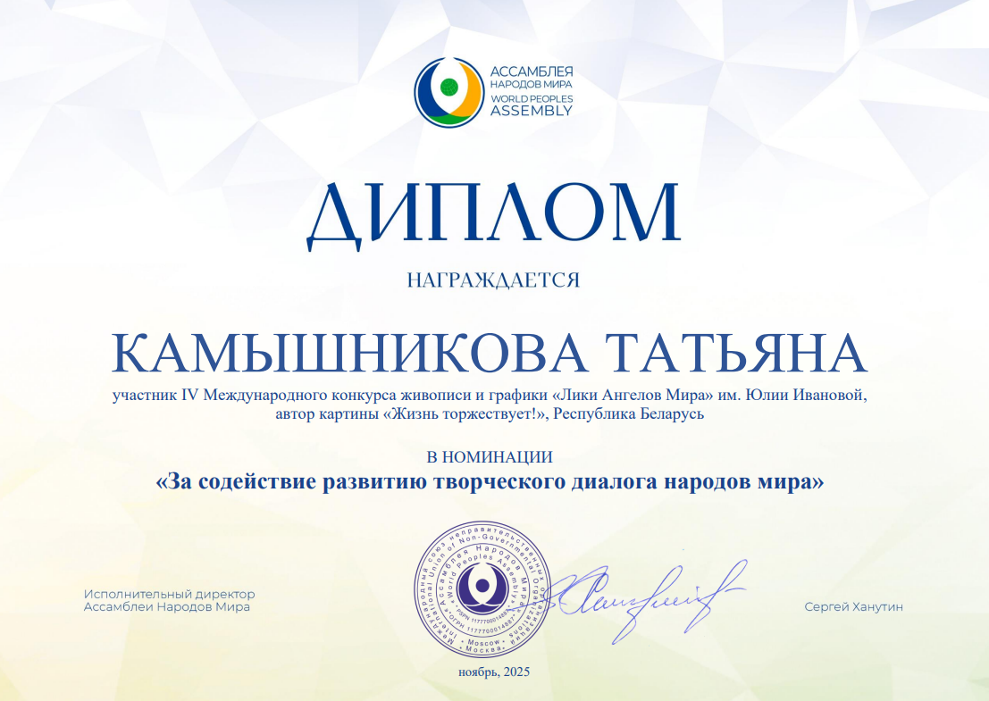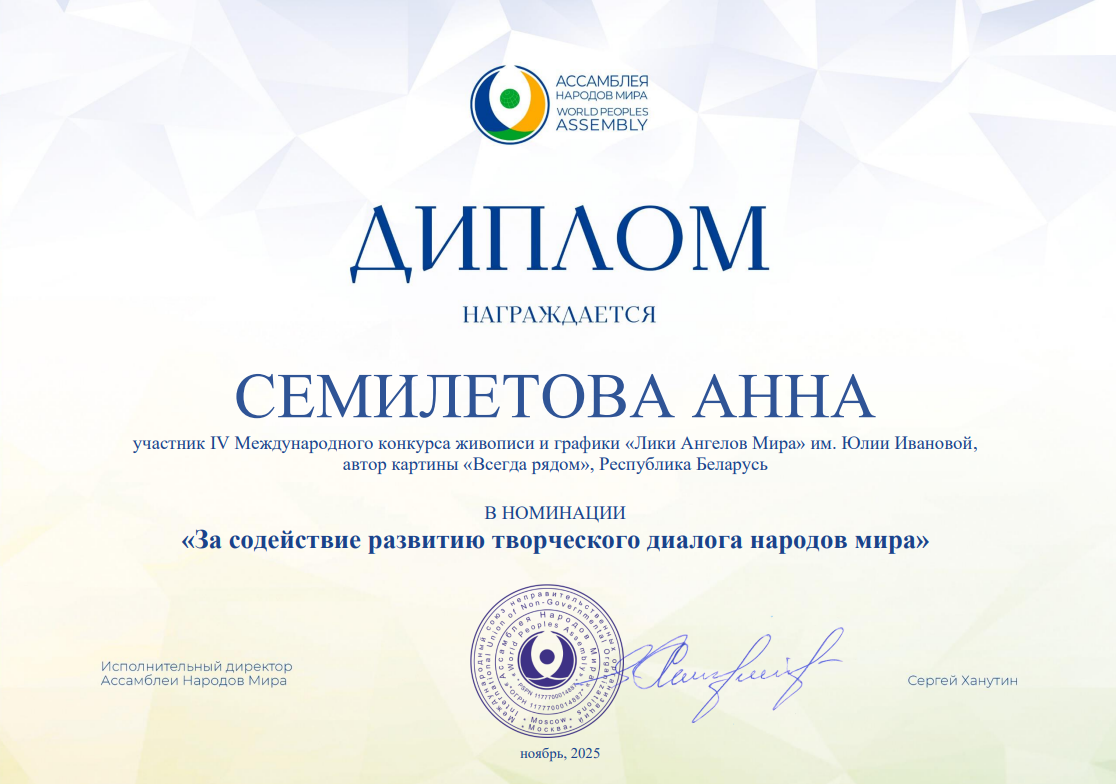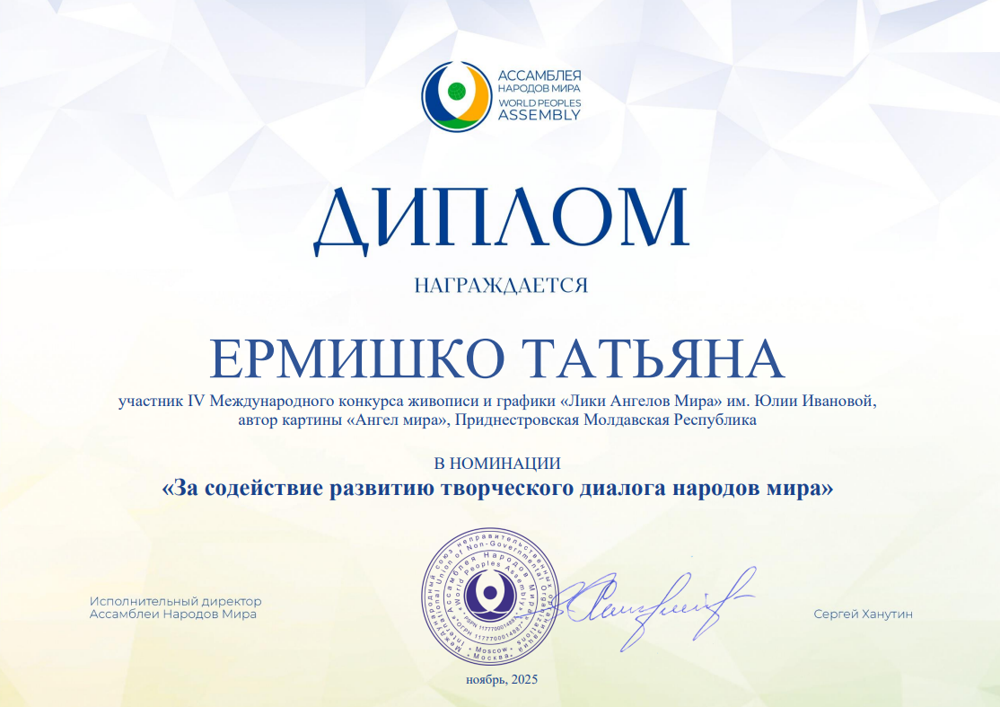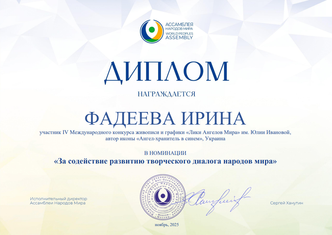 Несколько работ, принимавших участие в конкурсе "Лики Ангелов Мира" - 2025, а также их авторы из разных стран получили специальные Дипломы от Ассамблеи народов мира. Очень высокая оценка!