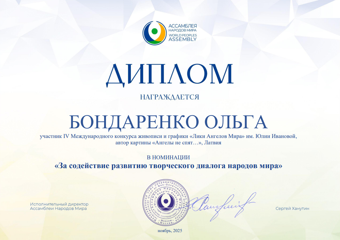 Несколько работ, принимавших участие в конкурсе "Лики Ангелов Мира" - 2025, а также их авторы из разных стран получили специальные Дипломы от Ассамблеи народов мира.